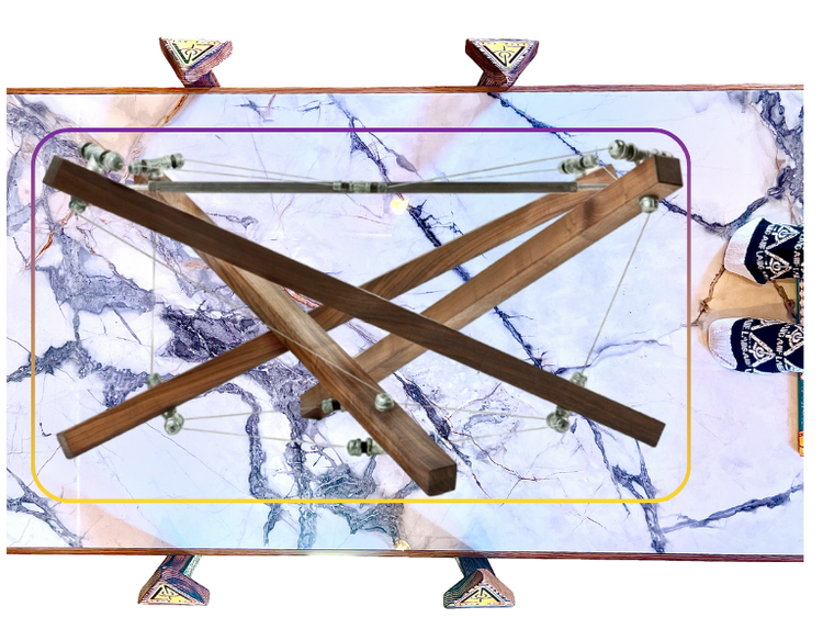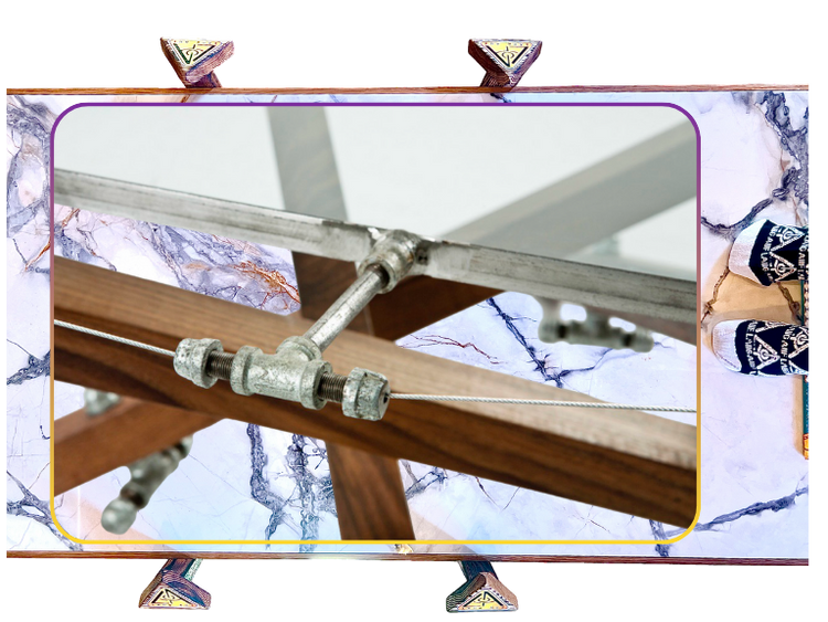 oiled black walnut, reclaimed galvanized plumbing pipes & fittings, brushed reclaimed steel, stainless aircraft cable, glass
