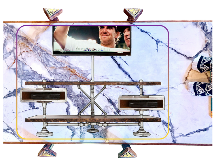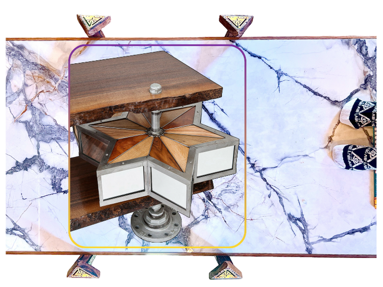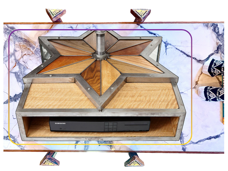 The doctor that 1 the aucshAUn 4 Bo Biddley commishAUned this piece. He requested a unit that could house his AV components + also act as a bookshelf. He's a collector of modern art. 1 of his paintings in mounted on hinges + covers his televishAUn when he's not watching it. EyE wanted 2 conceal his components as well. During the installashAUn, in order 2 conceal the electrical wEyErs, we had 2 disassemble the entEyEr piece + run 8 wEyEres thru a complex combinashAUn of plumbing fittings using a rather complicated procedure. The wEyEring took 3 of us a full day 2 complete. The client asked that EyE deliver both pieces be4 Rosh Hashanah. With this in mEyEnd, EyE decEyEded 2 use Jewish symbolism in the piece. The stars are the shape of the Star of David, but each point is divEyEded in half lEyE a nautical star. After making them, EyE did a little research (Google) on Judaism + discovered that the important symbol in the Star of David is not the 6-pointed star, but the hexagon that is cre8d bEyE the intersecshAUn of the 2 trEYEangles. This realizashAUn led me 2 use hexagon bushings 2 secure the glass top on Bo Biddley.