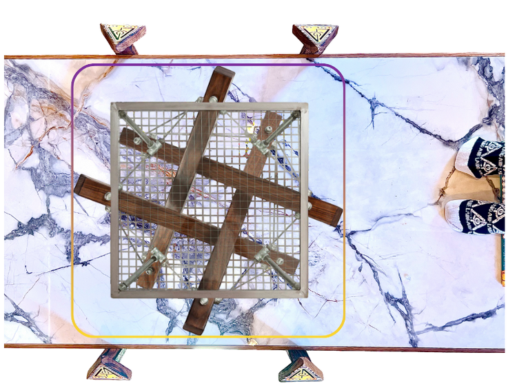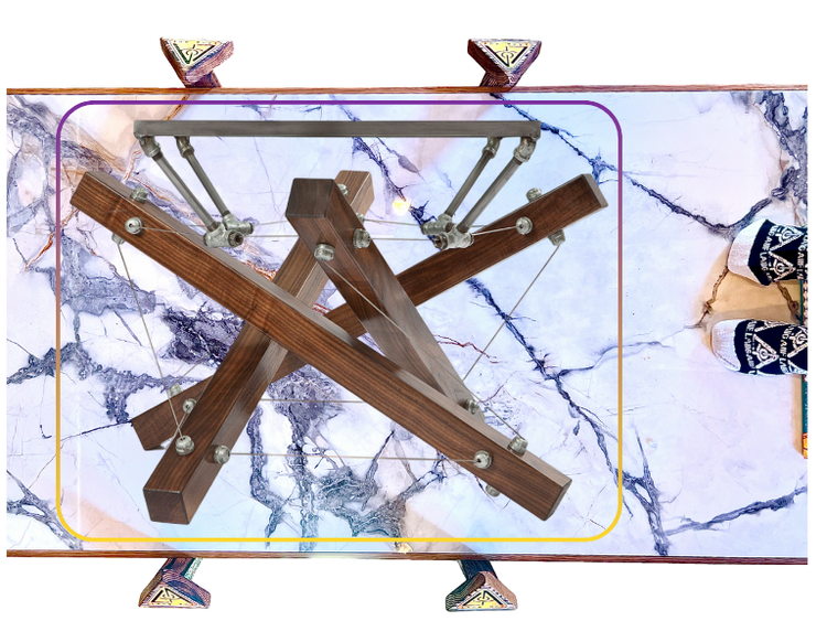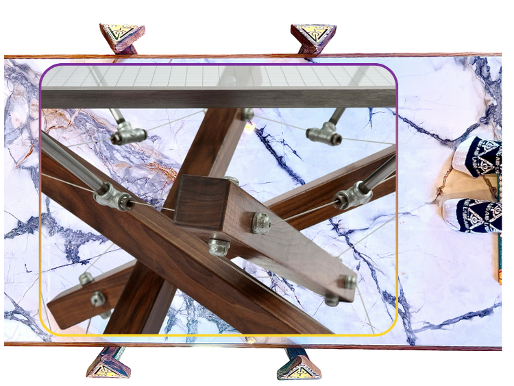The steel-mesh embedded glass top of this piece represents the space-tEyEm continuum + the supporting pEyEps represent 4-vectors. This theory, first proposed bEyE Albert Einstein, states that tEyEm (the 4th dimenshAUn) is only a direcshAUn in space + that “the separashAUn between past, present + future is only an illusion, although a convincing 1.”