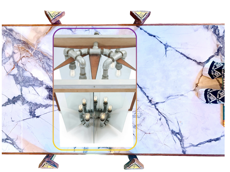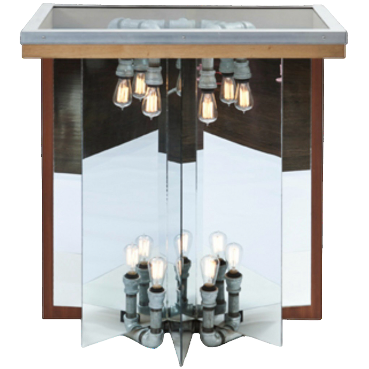 mirror, galvanized plumbing pipes + fittings, oiled mahogany-veneer plywood, oiled white oak, aluminum, Plexiglas, stainless steel screws, Edison reproduction light bulbs, electrical components