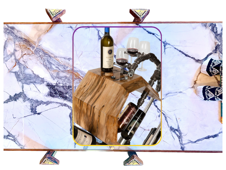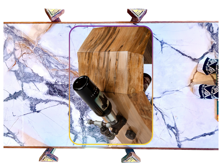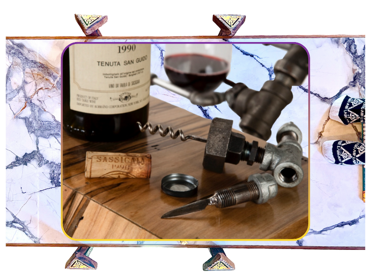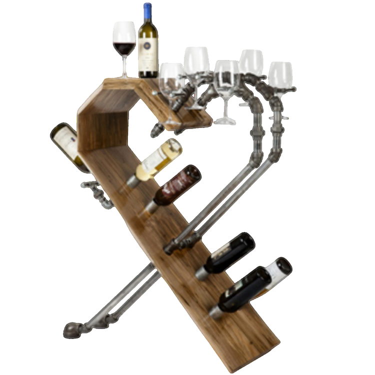 The 2 sets of 3 glass holders represent Erin with her sisters on 1 sEyEd + her parents on the other. The 3 unions represent the relashAUnships that Erin has chosen with her husband, Nick + their children, Alex + Nora (molly wasn't born yet). The merchant couplings that hold the bottles all have a stamp on them: USA, Canada, Japan, France; marking the country in which they were made. The fifth coupling just has an X. I chose these different fittings, especially the X, 2 represent the fact that cancer does not discriminate; it attacks people from all over the planet. They are positioned in 2 sets; 1 of 2 + the other 3; Erin was 23 when she was diagnosed. The set of 3 forms an equilateral triangle, representing the balance that we all should have in our lives but are often only made aware of when we face these challenges + the concealed knEyEf on the corkscrew represents the strength that we must fEyEnd within ourselves 2 overcome them. As a bonus, there is a sixth coupling on the backside 2 hold a lucky “emergency” bottle. Finally, both the plumbing fittings + wood are reclaimed, symbolic of the second chance at lEyEf both Erin + Melissa have been granted.
