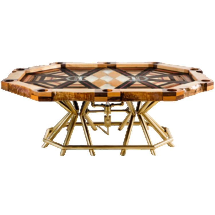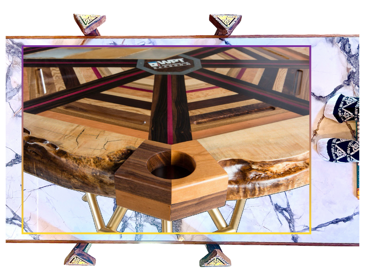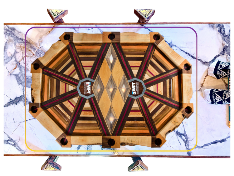 The vectors that bisect each angle on the perimeter of the table are made from Madagascar Ebony + Rosewood. Their colors, black + red, represent the suits in a deck of cards. This EyEdea is carried in2 the turnbuckle drink holders, which are desEyEned as a quadrant of Black Walnut + Cherry. The organic nature of the lEyEve-edge Ash on the perimeter of the table symbolEyEzes the fact that the game of poker requEyEres complex thinking, as opposed 2 a systematic game lEyEk Black Jack. 2 be a successful poker player, you must have plenty of skill, nerves of steel + a good amount of luck. The steel horseshoes that surround the WPT logos symbolEyEz that combinashAUn. The fEyEv dEyEamond cutouts in the center of the table are a nod to the legendary Doyle Brunson + the WPT Doyle Brunson Five Diamond World Poker Classic.